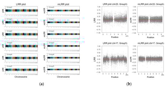 Due to the differences in the range of normalized values compared to the original LRR, adjustment to the original range was required. This involved resizing the original LRR SD and Z-score SD to a similar value, resulting in the creation of a new LRR value referred to as the modified LRR (mLRR). The offset effect was verified at the chromosome level: a wave was observed in the results using the LRR, while no wave was observed in the results of the mLRR (Figure 4a). This phenomenon was particularly pronounced at each end of the chromosomes (Figure 4b).