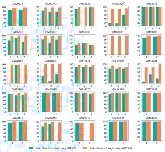 As a result, the utilization of mLRR yielded a more powerful detection performance than the original one. All the known CNV regions were detected with our new method from the 67 analyses, whereas some regions were missed in the analysis based on the standard LRR values (Figure 5 and Table S1). Among the 67 repeats, 7 (10.45%) were not detected in the standard LRR analysis. The length of the detected CNV was higher or the same as that of mLRR in all analyses, except for cases where it was not detected. For example, in the case of GM08039 with a known CNV spanning 22,723,028 bp associated with Trisomy 16, the mLRR method detected 99.977%, 95.508%, and 99.977% of the CNV region in three repeats, respectively. In contrast, when LRR was employed, CNV was not detected in 2 analyses out of 3 repeats, and only 0.404% was detected in one case. In the analysis of GM05876, which harbors a 1,435,491 bp CNV associated with DiGeorge syndrome, the CNV was detected in all analyses using LRR and mLRR. However, when LRR was employed, only 8.792%, 46.376%, and 24.800% were detected in three repeated analyses, respectively. In contrast, the method using mLRR exhibited high detection rates of 83.205%, 83.205%, and 99.843% (Figure 5 and Table S1).
