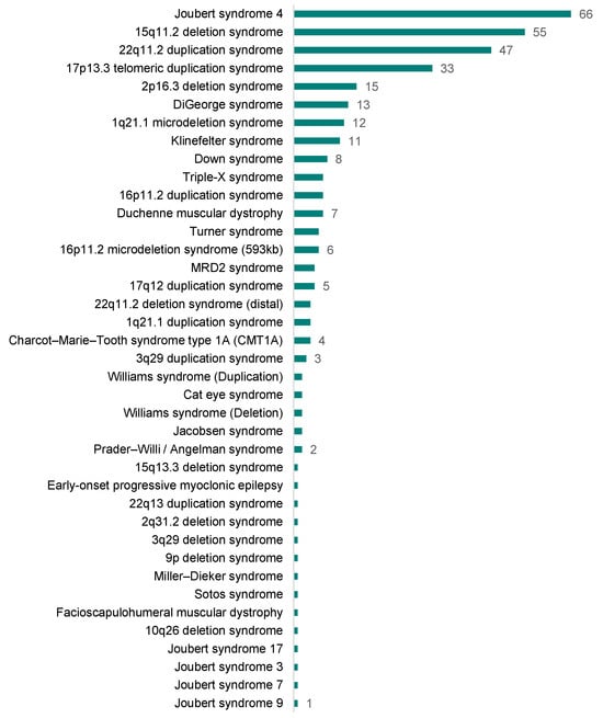The third and fourth most frequently detected CNV-related disorders were the 22q11.2 duplication syndrome and the 17p13.3 telomeric duplication syndrome, which were detected in 47 and 33 cases, respectively. The features of the 22q11.2 duplication syndrome, which is caused by an extra copy of a piece of chromosome 22 containing about 30–40 genes, are known to be varied even among family members (i.e., intrafamilial variability exists) []. Some with the duplicated gene exhibit intellectual or learning disabilities in addition to developmental delay, slow growth, and weak muscle tone (hypotonia) []. Duplications involving one or more genes on chromosome 17p13.3 are associated with split-hand/foot malformation and long-bone deficiency-3 (SHFLD3), with the duplication of the basic helix-loop-helix transcription factor of the A9 (BHLHA9) gene especially associated with limb defects. SHFLD3 is a relatively rare autosomal dominant skeletal disease with a penetration rate of <50% and features a broad spectrum of intraindividual variability [,]. The following genetic disorders involving CNVs were found in 11–15 of 16,046 cases: 2p16.3 deletion, DiGeorge, 1q21.1 microdeletion, and Klinefelter syndromes (Table S2).