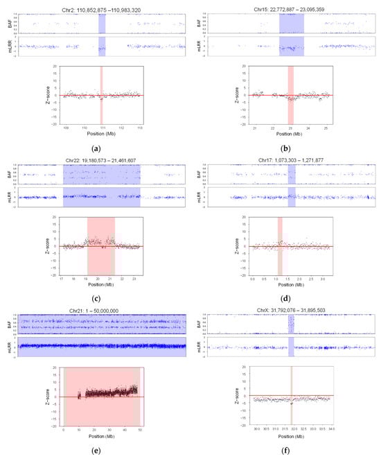 CNVs are associated with many neurodevelopmental disorders, such as autism spectrum disorders, schizophrenia, intellectual disability, attention deficit hyperactivity disorder, developmental delay, and epilepsy [,,]. As the variations often span several mega-base pairs that encompass multiple genes [,], the rarity and dose-sensitive nature of individual CNV genes must be accurately determined. For instance, altering the copy number of a dose-sensitive gene like BHLHA9 can be detrimental to disease pathogenesis, whereas changing the copy number of dose-insensitive genes is unlikely to cause harm []. Even within the same chromosomal region, CNVs may be associated with different phenotypes, ranges of severity, and incomplete penetration []. In the present study, among 39 detected cases of chromosomal abnormalities, 8 CNV-related chromosomal disorders were known to have complete penetrance: DiGeorge, Klinefelter, Down, Triple-X, Turner, Williams (duplication and deletion), and Prader–Willi/Angelman syndromes. For example, Duchenne muscular dystrophy (OMIM#310200), an X-linked recessive myopathy caused by a mutation in the dystrophin gene located at Xp21, has a penetration rate of 100% in males []. Charcot–Marie–Tooth syndrome type 1A (CMT1A), which was detected in four cases in our study, exhibits varying penetration rates depending on the parent. Fathers with X-linked dominant CMT1A have a 100% risk of having an affected daughter, whereas their sons face no such risk; conversely, both sons and daughters of mothers with X-linked dominant CMT1A have a 50% chance of being affected by the syndrome []. Joubert syndrome 4, the most frequently detected CNV-related chromosomal abnormality in our study, is a rare autosomal recessive disorder involving a ~290 kb homozygous deletion containing NPHP1 in 2q13. All Joubert syndrome 4 cases identified in our screening were heterogeneous deletions at 2q13; thus, the individuals were assumed to be carriers of the disorder in all cases. Other chromosomal disorders (i.e., 15q11.2 deletion, 22q11.2 duplication, 17p13.3 telomeric duplication, and 2p15.2 deletion syndromes, among others) detected in this study represent syndromes with various penetration rates. Additionally, while disorders involving visual and hearing impairments are often detected early, e.g., before the age of three, invisible autism, as well as emotional and behavioral disorders, are more likely to occur after the age of three []. Thus, it is very important to detect chromosomal abnormalities early and accurately in order to minimize the symptoms of the disease and slow its progression.