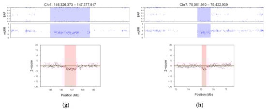 Validation results analyzing the same samples with a GSA array–based approach and NGS. A total of 8 chromosomal disorders are shown. The title displays the chromosome number along with the start and end positions of the detected region. The upper panel illustrates analysis results using the signal intensity patterns (B allele frequency, BAF) and modified log R ratio (mLRR). The vertical axis represents BAF and mLRR values, and each blue dot represents each value. The light blue color indicates the detected regions from the GSA. The lower panels represent the results from NGS analysis. The light pink regions represent the detected regions from the NGS. The vertical axis represents the z-score values, and the horizontal axis represents the positions: (a) Joubert syndrome 4; (b) 15q11.2 deletion syndrome; (c) 22q11.2 duplication syndrome; (d) 17q13.3 telomeric duplication syndrome; (e) Down syndrome; (f) Duchenne muscular dystrophy; (g) 1q21.1 deletion syndrome; (h) Williams syndrome (deletion).