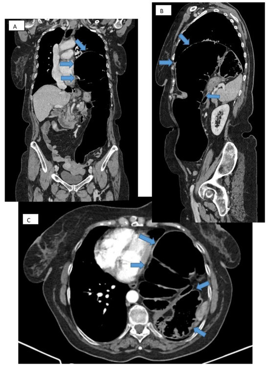 Computed tomography refines the diagnosis by accurately identifying the location, dimensions of the defect, the hernial sac, and the intrathoracic herniation of viscera [17] (Figure 3A–C). Tomographic imaging represents a key element in establishing therapeutic decisions. CT has a sensitivity for left-sided injuries that is greater (78–100%) than for right-sided injuries (50–79%). The presence of a pleural effusion, a pulmonary atelectasis, simultaneously with the identification of digestive viscera at the thoracic level is revealing for diagnosis.