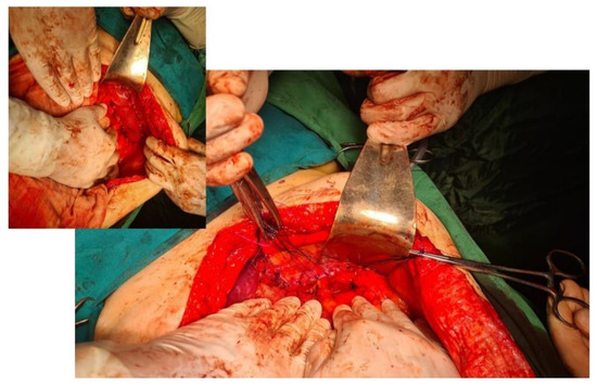 The diaphragmatic defect is usually closed by simple suture, with nonabsorbable sutures for minor defects [33,34]. Any hiatal defect that is larger than 5 cm2 (the hiatal hernia area (HSA)) has a formal recommendation for reinforcement—if the edges of the defect can be sutured—with either mesh or replacement if aggrandizement is not possible (Figure 5). Beyond the large size of the hernia, the use of mesh can also be recommended for cases with a diaphragm with a fragile texture, such as in patients with extreme obesity [35,36].