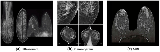 Medical imaging modalities for breast tissue: (a) ultrasound, (b) mammogram, and (c) MRI [10].
