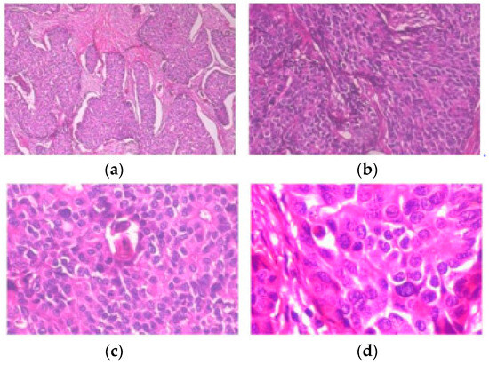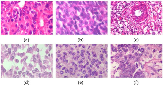 Centered on deep convolutional neural networks, a new BC histopathological image category blind inpainting convolutional neural network (BiCNN) model has been developed. It was developed to cope with the two-class categorization of BC on the diagnostic image. The BiCNN model uses previous knowledge of the BC class and subclass labels to constrain the distance between the characteristics of distinct BC pathology images [17]. A data-augmented technique is provided to suit the acceptance of whole-slide image identification [18]. The transfer-fine-tuning training approach is employed as an appropriate training approach [19] to increase the accuracy of BC histological image categorization. Figure 2 and Figure 3 demonstrate some of the finer characteristics of the pathological images of BC. Samples (a) through (e) in Figure 2 are all ductal carcinomas (DCs). The phyllodes tumor is sample (f). The colors and forms of the cells in samples (a)–(e) all belong to DCs, even though they are all DC samples. Samples (e) and (f) have a striking resemblance in terms of color and cell shape; however, they are classified as distinct classes. Figure 3 depicts abnormal images at various magnification levels. There is a substantial variance in the visual features across the various magnifications, even though they are all from the same subject [20].