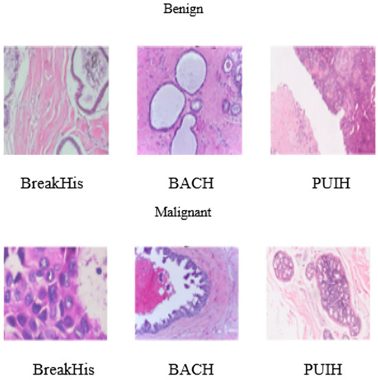 BreakHis, BACH, and PUIH are all publicly accessible BC histopathology image datasets used to validate the proposed DML model. There are 7909 histopathological images in the BreakHis dataset, each with three channels and four magnifications. PUIH has 4020 three-channel images, while BACH contains 400. The magnification of the images in these two datasets is not specified. BACH and PUIH include 2048 × 1536 pixel images, while BreakHis has images that are 700 × 460 pixels in size. An in-depth look at the three datasets is provided in Table 1. Figure 5 shows a selection of these photos.