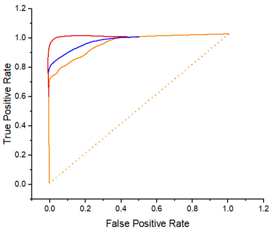 Figure 7, Figure 8 and Figure 9 demonstrate the parallel ROC curve and AUC value on every dataset. The results that are shown in Figure 8 illustrate the ROC curves and the AUC values for the BreakHis-200× dataset. The MA-MIDN-Ind model and the MA-MIDN-DML model lag behind the DML model. Considering all of them, it seems that DML performs a role that is energetic. In addition to enhancing the accuracy of the final organization, it could additionally validate the potential of the model to simplify complex situations by using the BreakHis dataset.