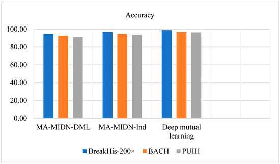 Table 2 illustrates the comparison of the current methodologies with the proposed methodology. Table 2 and Figure 10 show that the proposed DML model beats the MA-MIDN-DML model and the MA-MIDN-Ind model by a large margin on the BreakHis, BACH, and PUIH datasets.