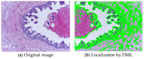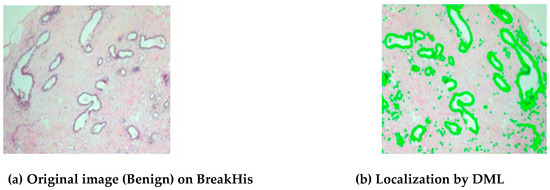 The DML model’s localization results consume most of the testing time, as shown in Table 7 and Table 8. This dataset has a lower image size than the previous two; therefore, the DML model runs quicker on it. For the BACH and PUIH datasets, the average classification time of the DML model was 0.09 s, while the average classification time for simultaneous localization was 1.55 s. These numbers are satisfactory to a certain degree, but they could be improved upon further.