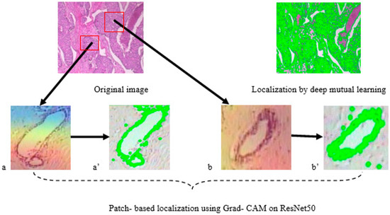 The Grad-CAM approach was used in conjunction with the ResNet50 model, which was trained on the BACH dataset. Figure 13a,b shows the breast glands from the original image of BACH dataset. Figure 13a’,b’ shows the GRAD-CAM patch based localization findings with ResNet50 model.