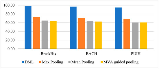The DML was compared to the other popular pooling approaches. It directly performs max and means pooling on instance-level features to achieve the test results. Figure 14 displays the results of the analysis.