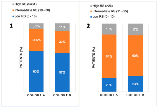 The mean RS was similar in both cohorts (17.72 (SD 9.59, IQR 10) in Cohort A vs. 17.89 (SD 9.53, IQR 12) in Cohort B, p = 0.533). There were no significant differences in the RS distribution between the two cohorts when compared and when based on the manufacturer’s thresholds (p = 0.15 for low RS 0–18, p = 0.833 for intermediate RS 19–30 and p = 0.15 for high RS > 31), or when based on TAILORx thresholds for RS categories (p = 0.817 for low RS 0–10, p = 0.199 for intermediate RS 11–25 and p = 0.795 for high RS > 26), as illustrated in Figure 1. Importantly, Figure 1 shows a shift in the risk groups from low to intermediate when new thresholds, as based on TAILORx study results, were applied. According to the manufacturer’s recommendations, up to 60% of patients had low RS (RS < 18), while only around 20% had a low RS (according to TAILORx thresholds (RS < 11)). Conversely, according to the original manufacturer’s guidelines, 8–10% were previously high risk (RS > 30), but more (around 15%) were high risk (RS > 25) (according to TAILORx). Consequently, the number of patients in the intermediate risk category increased from 30% to over 60% when the new RS threshold (11–25) was applied.