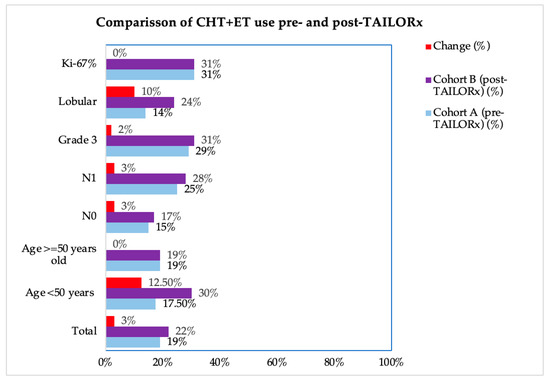 Change in the chemotherapy use in Cohort B (pre-TAILORx) and Cohort B (post-TAILORx) according to the patient and tumor characteristics. CHT-ET = chemoendocrine therapy. Note: percentages were rounded.