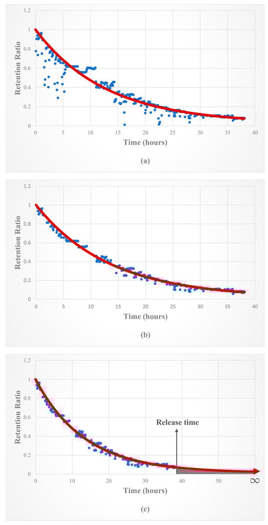 Approximately four hundred consecutive time points of detected radiation dose rates were recorded, yielding corresponding RRs. These sequential ratios were then fitted to a biexponential model. We utilized Microsoft® Excel Generalized Reduced Gradient (GRG) Nonlinear Solver to minimize the sum of squared differences between each recorded RR and the corresponding function value of the equation, thereby obtaining the most accurate functional curve for each patient’s metabolism of RAI (Figure 1a). However, fluctuations in recorded RR data may arise due to unrestricted patient mobility within the isolation ward. To address this, we applied Tukey’s method to identify and eliminate outliers []. This method partitions the data into quartiles, where Q1 comprises values equal to or greater than 1/4 of the data, Q2 includes values equal to or greater than 1/2 of the data, and Q3 includes values equal to or greater than 3/4 of the data. The interquartile range (IQR) is calculated as the difference between Q3 and Q1. According to Tukey’s rule, outliers are defined as values that deviate by more than 1.5 times the IQR from the quartiles, either below (Q1 − 1.5 × IQR) or above (Q3 + 1.5 × IQR). After removing the outliers, the data were refitted to the biexponential equation, resulting in a more realistic functional curve for estimating the patients’ RAI biokinetics. With Tet (the effective half-life of RAI in extra-thyroid tissue) and Ft (the RAI uptake fraction of the thyroid tissue) values as variables, we utilized GRG Nonlinear Solver to derive these biokinetic parameters for each patient (Figure 1b).