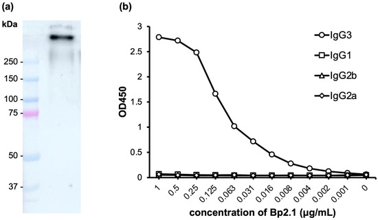 Bp2.1 is a mAb isolated from mice immunized with heat-killed B. pseudomallei using the standard hybridoma technique. The mAb Bp2.1 was purified from the hybridoma supernatant and characterized by western blotting and indirect ELISA (Figure 1). The western blot analysis was performed with Bp-PS blotted on the nitrocellulose membrane and probed with Bp2.1 mAb, followed by the goat anti-mouse IgG HRP conjugate. The result showed that Bp2.1 reacted to the antigen larger than 250 kDa (approximately 300 kDa), which corresponds to the size of the capsular polysaccharide (CPS) (Figure 1a) [26]. The indirect ELISA was carried out with the inactivated B. pseudomallei coated on the ELISA plates, followed by Bp2.1 as a primary antibody and the subclass-specific goat anti-mouse IgG3, IgG1, IgG2b, and IgG2a HRP conjugates as secondary antibodies. The results demonstrated that the mAb Bp2.1 is an IgG3 subclass (Figure 1b).