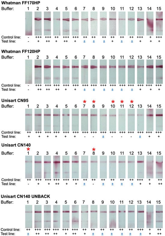 An optimization of the LFIA was performed with five different types of nitrocellulose membranes and 15 different recipes of chasing buffers, generating a total of 75 conditions to be tested. First, the LFIAs were screened with 20 μL of PBS as a test sample (Figure 2). The LFIAs with Whatman FF170HP showed detectable test lines with all chasing buffers except buffer no. 1, in which an invalid test result was observed. These results were found to be similar to those from the Whatman FF120HP. Additionally, uneven control and test lines were observed for these two membranes. Similar results were observed for LFIAs with the Unisart CN140 unback. However, unlike the Whatman membranes, CN140 unback LFIAs (also CN95 and CN140) did not produce an invalid result with chasing buffer no. 1, and the control and test lines are smoother.