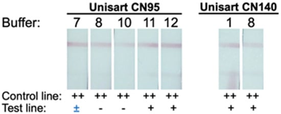 For Unisart CN95 and CN140 LFIAs, there are five conditions (with chasing buffer no. 7, 8, 10–12) and two conditions (with chasing buffer no. 1 and 8), respectively, that did not yield false positive results, while the rest produced various degrees of background at test lines. Overall, a total of seven conditions that produced a clearly visible control line with an undetectable test line were selected. The selected conditions were subsequently tested with 20 μL of BacT/ALERT PF Plus hemoculture media (BioMérieux, Durham, NC, USA) (Figure 3). Out of the seven conditions selected, five LFIAs exhibited false positive results, leaving only two suitable LFIAs for the next step of development. Among these two, the LFIA with Unisart CN95 membrane and KB-BS-0008 (tris buffer containing casein and Surfactant 10G) chase buffer was chosen for the prototype because of the smoother flow pattern observed during the test. All other parameters and components used to construct the prototype LFIA are summarized in Table 2.