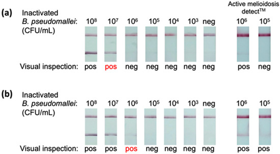 During the infection, B. pseudomallei presents not only in the patient’s bloodstream but also in urine [12,40]. A study performed by Wuthiekanun et al. reported that the median concentration of B. pseudomallei in urine samples was 1.5 × 104 CFU/mL, with the highest and lowest concentrations of ≥1 × 106 CFU/mL and ≤1 × 103 CFU/mL, respectively [40]. In this study, the prototype LFIA’s LOD was 1 × 106 CFU/mL in artificial urine (Figure 4b). This LOD value suggested that the ability of the LFIA to detect the bacterium straight from urine samples was only marginal, and its sensitivity must be improved.