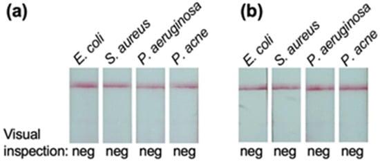 The potential cross-reactivity to other bacteria was tested. The bacterial panel tested included S. aureus and P. acne as representatives of Gram-positive bacteria and E. coli and P. aeruginosa as representatives of Gram-negative bacteria. The tests were performed with the killed bacteria spiked in the hemoculture medium matrix (Figure 5a) and the urine matrix (Figure 5b) at a final concentration of 108 CFU/mL. In the two matrices tested, the prototype LFIA showed no cross-reactivity with these bacteria.