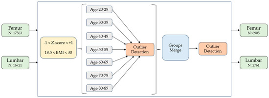 In order to obtain a cohort of patients with normal BMD values in relation to age and sex, only subjects with −1 < Z-score < 1 were selected. Furthermore, subjects with BMI < 18.5 kg/m2 and BMI > 30 kg/m2 were excluded to obtain a normal weight population. Participants younger than 20 years were also excluded, and the population was divided into 7 age groups: 20–29, 30–39, 40–49, 50–59, 60–69, 70–79, 80–89. After an outlier detection process, 6905 women for the femur and 2761 for the lumbar spine were included for the construction of the age-specific BSI curves. This methodology is graphic in Figure 1.