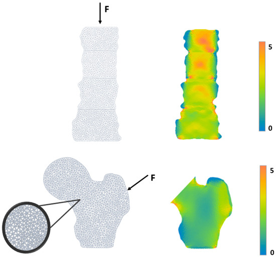 Examples of lumbar and femur BSI analysis: The BSI calculation uses Finite Element Method (FEM). The FEM analysis generates a 2D model of the bone segment starting from the bone segmentation, carried out by the DXA software (v5.6). A patient-specific load is applied to each 2D model, divided into triangular elements (mesh). Based on the density distribution, the bone strain is calculated at each geometric element of the mesh. BSI represents the average equivalent strain inside the bone, with the assumption that a higher strain level (high BSI) indicates a more significant risk condition [3,14].