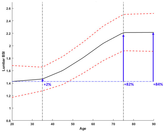 BSI age-related changes for lumbar spine (L1–L4). The mean BSI value for the specific age is represented by the black. Red dashed lines represent the two standard deviation lines. The graph highlights three different areas depending on the slope: before 35 years, between 35 and 75 years, and after 75 years. BSI value increases by 2% between 20 and 35 years (slope equal to 0.0026/year), by 78% between 35 and 75 years (slope equal to 0.0193/year), and by 2% after 75 years (slope equal to 0.0021/year).