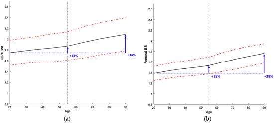 As shown in Figure 4, two different increases with age can be observed regardless of the ROI chosen: before age 55 and after age 55. After age 55, Neck BSI and F-BSI values increased at a rate three times and 2.7 times faster, respectively, than before age 55. Full data is reported in Table 4.