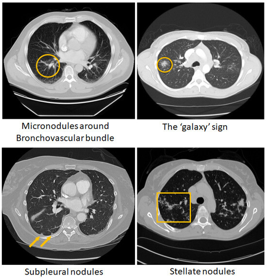 The chest CT images for clinically confirmed pulmonary sarcoidosis (PS) (n = 126) were obtained from an IRB-approved study at Albany Medical College (AMC) (refer to the Compliance and Ethical Standards section for details). Chest CT exams for outpatients at AMC were performed using GE Revolution 256 CT scanner and GE VCT Lightspeed 16 slice scanner with a variety of protocols with an in-plane (xy) (512 × 512 matrix) resolution between 0.625 and 1 mm, and z-resolution of 1.25–5 mm. Patients in the pulmonary sarcoidosis database were, on average, 48.9 years of age (22–84 yrs), female (n = 77), male (n = 48), unspecified (n = 1), and white (n = 101), black (n = 17), Asian (n = 2), unspecified race (n = 6). Images of lung cancer (LCa) cases (n = 93), comprising both primary (n = 42) and metastatic (n = 51) instances, were sourced from the TCIA (LIDC-IDRI) public archive as described in previous studies [53,54]. The 3D CT volumes were center cropped in axial view to focus on the lung region, and then resized to 256 × 256 × 64. Figure 1 shows some of the chest CT patterns of pulmonary sarcoidosis.