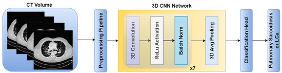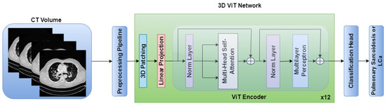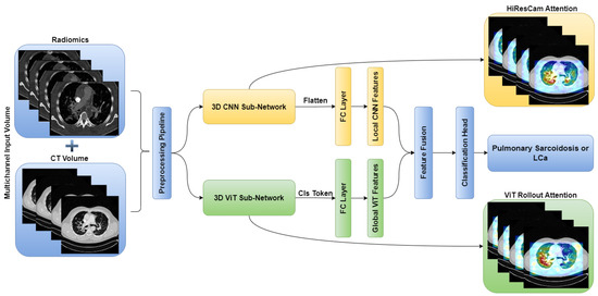 On the contrary, the 3D ViT encoder focuses on capturing global features by treating the input as a sequence of 3D patches, each with a size of 16 × 16 × 16. The 3D ViT encoder consists of 12 transformer blocks with a hidden layer dimension of 768, and each block utilizes multihead self-attention with 6 heads. The outputs from the 3D CNN feature extractor and the 3D ViT encoder are finally concatenated and fed into a fully connected (FC) layer with sigmoid activation for the classification of pulmonary sarcoidosis vs. LCa. Binary cross-entropy was used as a loss function with AdamW optimization; a learning rate of 1 × and 50 epochs were used to train the network. Additionally, we utilized random flip, random noise, and random affine transformations from TorchIO [59], a Python library designed for medical imaging augmentation, to augment the 3D data during training. An overview of the combined CNN-ViT network architecture is shown in Figure 4.