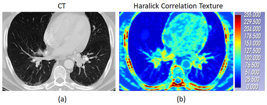 The CT of a case of pulmonary sarcoidosis and its corresponding Haralick correlation texture map are shown in (a) and (b) respectively.The color bar shows the radiomic values normalized between 0 to 255.