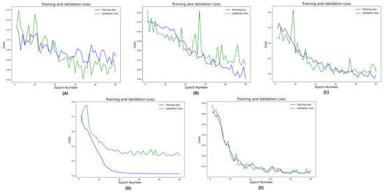 Training and validation loss curves (one-fold) for 50 epochs for the methods in ablation study: (A) CT-ViT, (B) CT-CNN, (C) CT-CNNViT, (D) Rad-CNNViT, (E) RadCT-CNNViT.