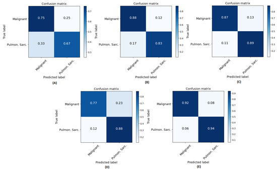 Normalized confusion matrices for all methods across all folds: (A) CT-ViT, (B) CT-CNN, (C) CT-CNNViT, (D) Rad-CNNViT, and (E) RadCT-CNNViT. ‘Pulmon. Sarc’. in axes labels is the abbreviation for pulmonary sarcoidosis and ‘malignant’ relates to LCa.
