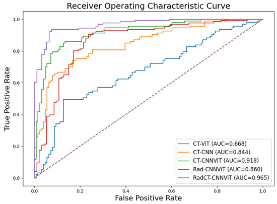 Combined receiver operating characteristic (ROC) curves for CT-ViT, CT-CNN, CT-CNNViT, Rad-CNNViT, and RadCT-CNNViT. The dotted, diagonal line represents the ROC curve for random guess.