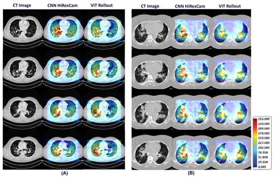 HiResCAM and ViT Attention Rollout visual explanations that highlight the regions of interest on CT scan associated with diagnosis of pulmonary sarcoidosis (A) and lung cancer (B).