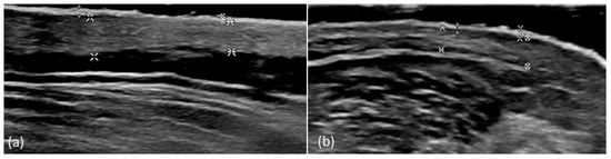 Lacarrubba, F. et al., in a study that included 30 patients with mild/moderate psoriasis vulgaris, demonstrated the usefulness of US (20 MHz) in evaluating the therapeutic response to clobetasol propionate 0.05% []. The US can identify the complications of prolonged therapy, with local cortisones such as skin atrophy [].