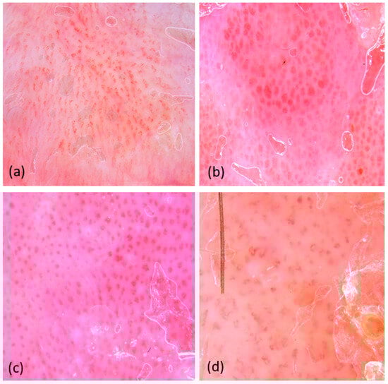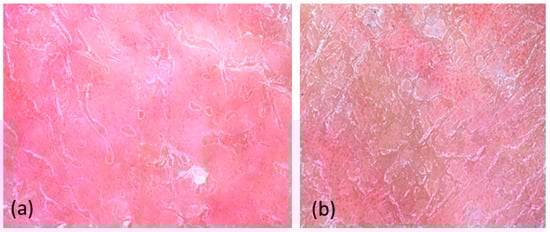 Dermatoscopy and videodermatoscopy are useful, both in supporting the clinical diagnosis of psoriasis and in monitoring the therapeutic response. The most common dermatoscopic appearance is the presence of dots/red blood cells on an erythematous background observed from 97.1% to 100% in the literature []. In our study, the most frequent dermatoscopic appearance was an erythematous plaque, with dotted vessels with regular distribution on the surface, covered by white scales with diffuse localization. Although we only analyzed lesions from the trunk and limbs, linear vessels were identified in only one case, an aspect also encountered less frequently by Lallas et al. []. The change in the type and morphology of the vessels in the psoriasis plaque varies with the response to the therapy [].