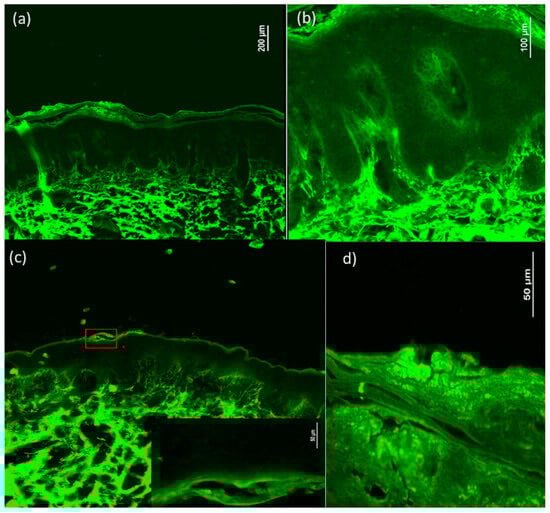 Using a super-resolution Re-Scan Confocal Microscopy system (RCM-VIS unit) that was purchased from Confocal.nl (Amsterdam, The Netherlands), fluorescent confocal images of psoriasis plaque were captured. The system was placed on an ECLIPSE Ti2-E inverted microscope (Nikon), which had a Plan-Apochromat 10× objective (N.A. = 0.45). To be more precise, the RCM-Vis images were produced using a diode laser set at 488 nm (TOPTICA Photonics AG, Martinsried/Munich, Germany), and then the NIS Elements program (version 5.11.02) (Nikon, https://www.microscope.healthcare.nikon.com/en_EU/products/software/nis-elements, accessed on 30 January 2024) was used to analyze the data. The sections were analyzed together with a physicist with extensive experience in confocal microscopy, in order to identify the histological consecrated features correlated in fluorescence confocal microscopy. We followed the criteria proposed by Bertoni L et al. [].