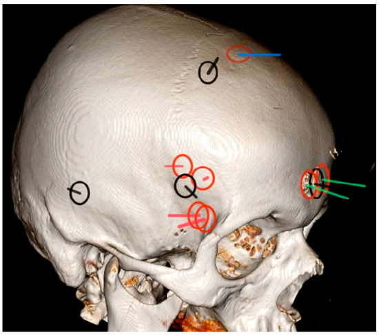 The head computed tomography model depicts entry bone wounds marked by circles and corresponding trajectories marked by lines within the circles for all patients. Nine injuries were on the right side and two were on the left side of the head. Trajectories only show their approximate direction and not their depth. For the ease of visualization, all injuries on the left side were symmetrically translocated to the right side. Surgically treated cases are denoted by red circles. Cases treated with only palliative conservative care are represented by black circles and black trajectories. Two of the surgically treated patients with ischemic areas due to the vascular injury of the anterior circulation are presented by green trajectories. Red trajectories indicate surgically treated cases without major vascular injury. The blue trajectory shows the case with the injury of the superior sagittal sinus.