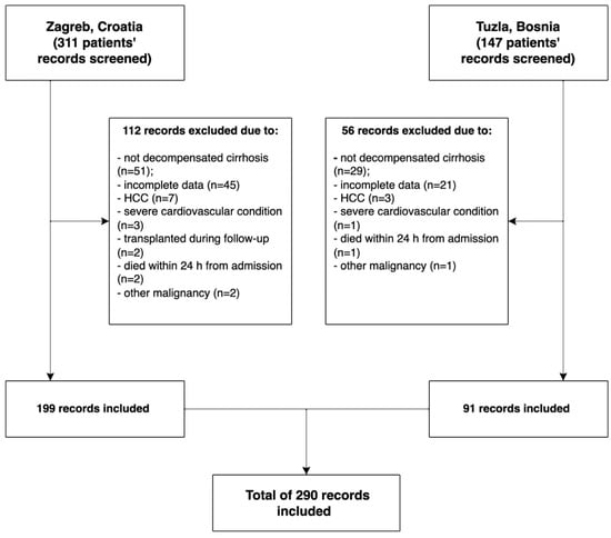 In this study, we conducted a retrospective analysis of medical records from 290 patients who were hospitalized with decompensated liver cirrhosis at two gastroenterology departments in Croatia, Bosnia, and Herzegovina. Of these patients, 199 (68.6%) were from University Hospital Dubrava in Zagreb (between 2014–2017), while 91 (31.4%) were from University Clinical Center Tuzla (between 2016–2017)—Figure 1.