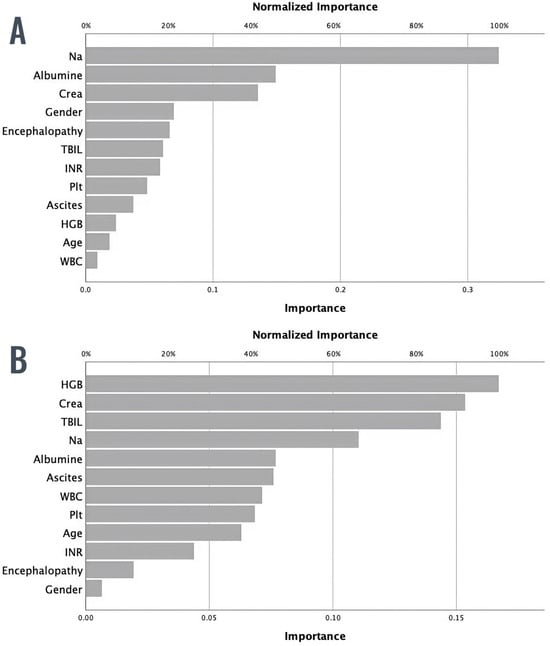 We attempted to explain the intricacies of our models, at least partially, with graphs depicting the normalized importance of input variables for each of our particular models (Figure 2A,B). As seen, the most usual suspects, such as sodium, albumin, bilirubin, and creatinine, are among the three most important variables. The hemoglobin level, although not the usual parameter included in the conventional scoring systems for mortality in cirrhosis, has been shown to be a significant risk factor for mortality in liver cirrhosis [] and emerged as a variable of significance for mortality in other studies that used ML models to predict death in cirrhosis [].