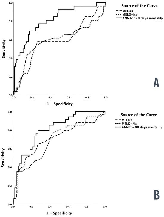 In our evaluation of the predictive potential for mortality in patients with decompensated cirrhosis, the corresponding area under the curve (AUC) values for 28- and 90-day mortality were suboptimal for both MELD-Na and MELD 3.0 scores, as shown in Figure 3A,B. Despite the fact that MELD 3.0 includes other relevant parameters such as albumin and female gender to improve the original formula, the improvement between MELD-Na and MELD 3.0 is modest, if not small, as already discussed by the authors of MELD 3.0 []. We strongly believe that the problem is not the parameters included in the final formula of the score, but rather the inherent inability of conventional statistical methodology to describe biological systems. Therefore, we speculate that current models used to predict mortality in decompensated liver cirrhosis can be vastly improved with superior predictive methods such as ML.