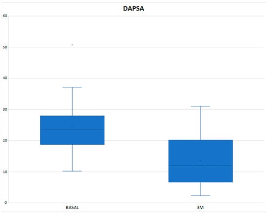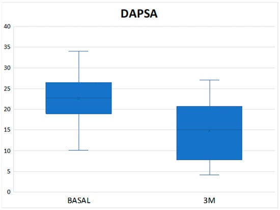Differences in PsA activity scores measured with the DAPSA between baseline and 3 months of treatment in 32 patients who received a JAKinihb. DAPSA (Disease Activity Index for Psoriatic Arthritis); 3M (three months); * p < 0.05 vs. baseline.