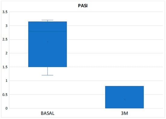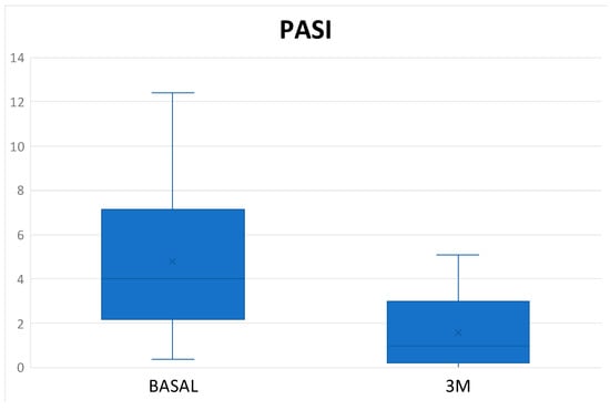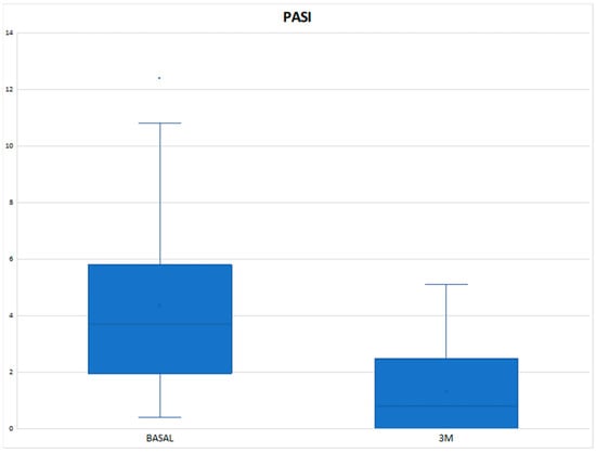 Differences in PsO activity score measured by PASI between baseline and 3 months of treatment in the 26 patients with psoriasis at baseline who received a JAKinhib. PASI (Psoriasis Area and Severity Index); 3M (three months); * p < 0.05 vs. baseline.