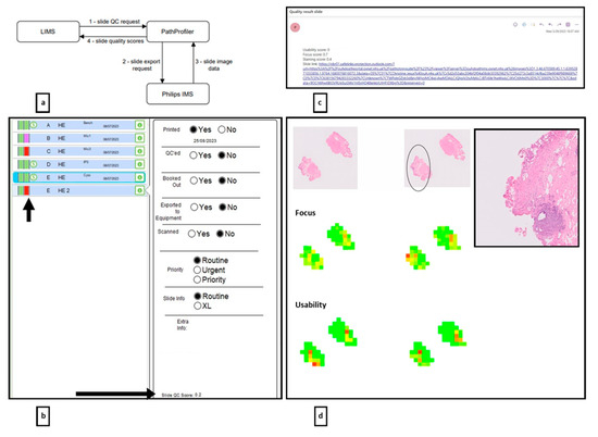 For each scanned slide with a GU case code, the Laboratory Information System (LIS) automatically sent a QC request to the server hosting PathProfiler, at which point the corresponding slide image was exported from the Philips IMS and analysed by PathProfiler. The produced quality scores were then returned to the LIS (Figure 2a). All the components in the workflow were hosted on our internal trust IT systems behind our institutional firewall.