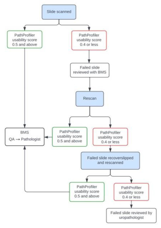 In this study, our automated digital image quality tool ‘PathProfiler’ was integrated into the clinical workflow at a point immediately following slide scanning, providing a quantitative measurement of WSI quality by way of a Usability Score. Based on our previous work we set the ‘cut-off’ for the US at 0.4, with WSI scoring 0.4 or less being flagged to the laboratory team in real time. The flagged WSI could therefore be assessed and remedial action instigated, which was typically cleaning and re-scanning of the GS.