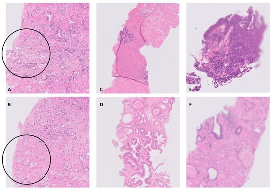 Subjective assessment of image quality was at the level required for diagnostic purposes. In the case of prostate biopsies, the image quality needed to be high and at high power magnification. Quality-impacting issues were categorised as no significant issue/minimal issue (not impacting on diagnosis), minor issue (may not impact on diagnosis), and severe issue (impacting on diagnostic usability). The examples in (A,B) show very minor out-of-focus areas (circled) which would not impact on diagnosis (no significant issue). (C,D) show ‘minor’ issues where the focus quality is suboptimal but the detail of the image is probably sufficient for diagnostic assessment, whereas in (E,F) the quality of focus is insufficient for diagnosis (severe issue).