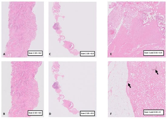 The 83 slides from flagged WSI were cleaned and re-scanned. Of these new WSI, 30 (36%, 30/83) had improved US of 0.5 or above, which was concordant with subjective improvement in 24 WSI (80%, 24/30, examples shown in Figure 6A–D). It is noteworthy that five of the remaining 6/30 suboptimal WSI did not have a significant image quality issue on initial subjective assessment (prior to re-scan, examples shown in Figure 6E,F), four of these five were from UREs, and the other was from a bladder TUR showing severe cautery artefact and inflammatory exudate considered likely responsible for the low US rather than there being an issue with the digital image quality per se (Figure 6E). The remaining one WSI (also a URE slide) was considered to have a quality-impacting issue on subjective assessment that remained following re-scan in spite of the improved US, although this issue was considered to be minor and would not have impacted on diagnosis.