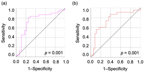 The optimal cut-off value was determined by analyzing the ROC curve between EAOC and OE. When considering atypical or borderline tumors as EAOC, OE can be distinguished with a cut-off of 15.74. The sensitivity and specificity of this cut-off are 80.6% and 75.0%, respectively, with an AUC of 0.750 (p < 0.001) (Figure 2a). EAOC can be distinguished with a cut-off of 16.87, separating atypical/borderline cases from EAOC ones (sensitivity 87.0%, specificity 61.1%, AUC = 0.750, p < 0.001) (Figure 2b).