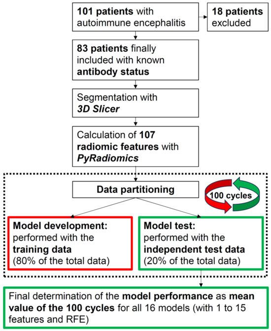 Given these favorable results showing radiomics’ potential in differential diagnosis and prognosis prediction in AE, we sought to apply the radiomics approach to our cohort of AE patients. Because detection of antineuronal antibodies still plays an important role in confirming suspected AE cases, we aimed to explore the non-invasive prediction of seropositivity by building an ML-backed classifier model. This approach could potentially be of interest for expediting diagnostic workup, especially in institutions with limited resources for laboratory testing. With recent studies suggesting antibody-specific structural and metabolic correlates in the mesial temporal lobe [26,27], we chose to train our model on radiomics features obtained from bilateral segmentation of the amygdala.