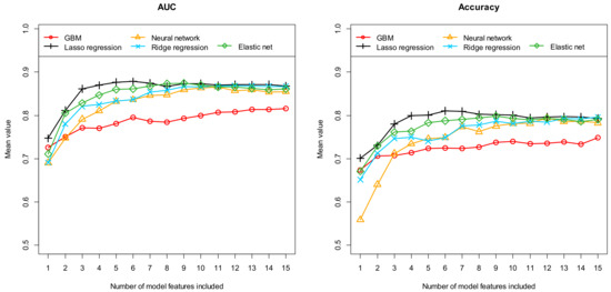 As already explained, we used two different methods to preselect the features to be included in our models: Firstly, recursive feature elimination and secondly, we developed all models with an increasing number of features, each containing the most important 1 to 15 features. In the final modeling phase, we pursued those machine learning algorithms that proved most promising based on the preliminary studies previously conducted with AutoML. GLMs (Lasso regression, ridge regression, and an elastic net) and neural networks followed by GBMs proved to be particularly promising for discriminating autoimmune encephalitis patients with detected and undetected antibodies.